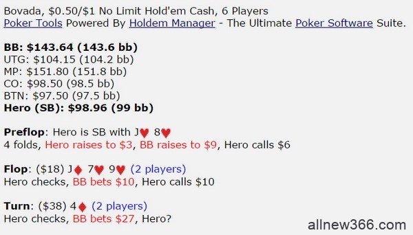 我在SB位置第一次拿到这样的牌也会翻前弃牌。至于翻后的打法,翻牌圈check-raise到全压或者所有下注圈都check-call。有些翻前“松凶”的家伙,在转牌圈或河牌圈会变紧。因为你只有对手20手牌的记录,不知道他转牌圈和河牌圈的侵略性,翻牌圈check-raise更好一点。