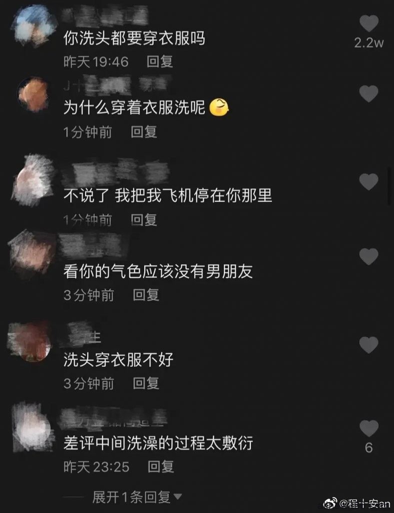 惨还是程十安惨,穿着衣服洗澡本身就又难受又冷,还要面对这些删都删不完猥琐言论。