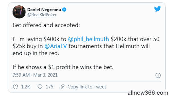 在播客中,丹牛开出了2-1的竞猜赔率–他的40万美元对20万美元–如果Hellmuth最终能胜出。