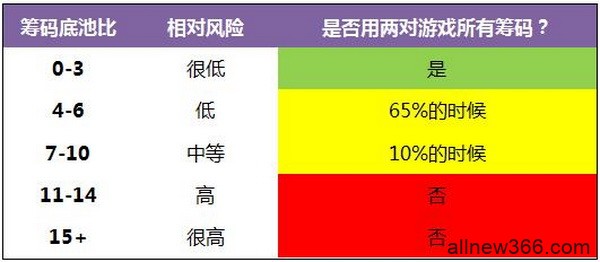 在各种不同的筹码底池比场合找到你愿意游戏全部筹码的程度不是很容易,特别是在这种翻牌面,当你遭遇挑战时,你不得不阅读对手。你对对手的阅读应该比下面的表格更有作用,但要注意,筹码底池比仍然是你翻后决策制定的一个重要部分。