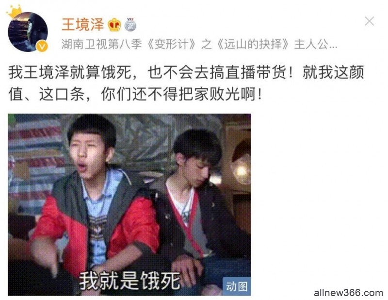 下面配了’真香’的图片,一般王境泽说不干嘛,那就是一定会干嘛了。所以也就是,接下来王境泽要直播带货了。