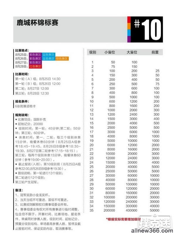 鹿城杯比赛一共四天,采取普通前置预置分的模式(每名运动员交前置预置分)8月25日-26日为第一轮(A,B两个组别),起始记分20000,级别时间40分钟,每组进行13个级别后结束, 当天不可重进,晋级不能重进;8月27日为第二轮,级别时间50分钟,进行12个级别后结束;8月28日为第三轮,级别时间60分钟,产生冠军。