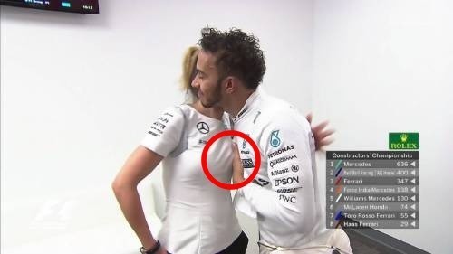 噹啦~就是這個!有看出來哪裏特別嗎?畫面裏賓士車商的美麗女員工來跟Hamilton打招呼~兩人熱情的互相擁抱!