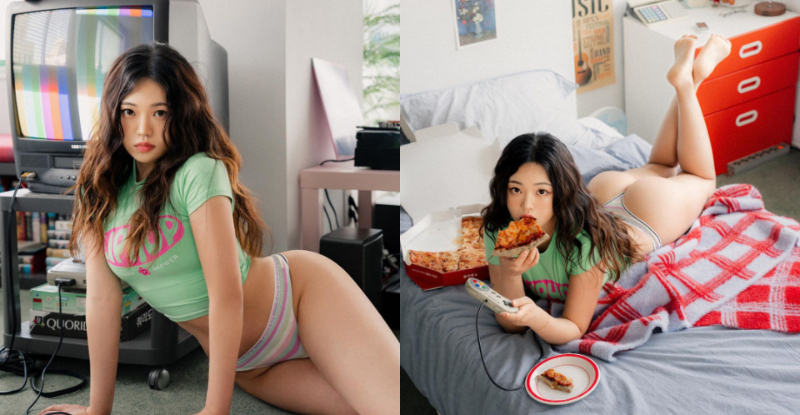 這也太可口了吧!當然不是指Pizza,而是那鮮嫩翹挺的蜜桃臀!眼前這位連居家宅樣也能很性感的妹子就是【善】,一頭羊毛捲的慵懶長髮,輛綠色短T罩著那雙渾圓飽滿的雙峰,露出的水蛇腰間更是緊致,隨興地趴在床上嗑著Pizza的模樣真是讓人垂涎三尺,多想享用那顆蜜桃!