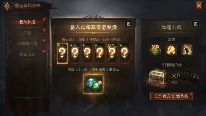 活动期间每天登入都可以拿到传奇装,登入满七天还可以免费领取两星宝石,并且有加速升级,最高可以获得1500%的经验加成,回归者可以获得为期七天在地城中的增益效果,并且在队伍中所有成员完成地城之后,还可以获得奖励宝箱,还有每日登入可以额外获得复活石的充能次数两次,如此便在战力跟资源的获取上可以在短时间有显著的提升。此活动有为期三十天左右的时间去完成任务,在完成任务之后可以获取大量经验值。