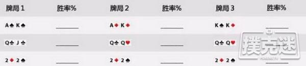 以下是三个牌局中三人全压局面。你能够正确(或接近正确地)填写每手牌的胜率吗?看答案之前不妨试试看吧。