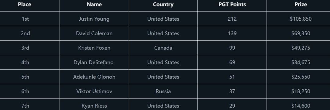 美国选手Justin Young凭借顺利的开局一路前进,最终打败赛事#1冠军David Coleman后夺冠,收下$105,850奖金。