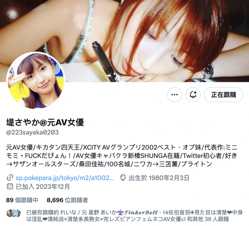是真的。没错,2001年出道,曾经是AV界最好的萝莉女优「堤さやか(堤沙也加)」在退休超过20年后终于在社群网站上现身,自我介绍上写了,她目前是在「AV女優キャバクラ新橋SHUNGA」(AV女优酒店新桥SHUNGA)上班,想一睹传说女优的绝世容颜就去预约吧〜