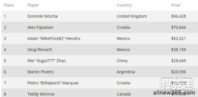 中国选手Wei“dugui777”Zhao获得第五名及38,199美元,随后 Sergi Reixach和Adam "MikePrice82 "Hendrix体力不支,分别倒在第四名和第三名。