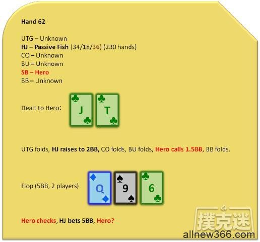 查看下图中的牌例62,试着确定哪些因素与前一手牌不同,以及Hero的决定是否应该不同。你应该总是在查看我的分析之前自行思考每一手牌。如果你以一种自动驾驶模式被动地阅读这一节,而且几乎不出声,那么停下来,回过头积极地评估上面的局面。这本手册的难度正在开始加深,集中精力和积极参与是正确理解本书的关键。