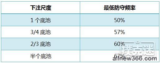 因为两个牌手都是宽范围,在大多数翻牌面胜率将非常接近。换句话说,两个牌手的范围对抗彼此都有约50%胜率。这意味,在理论上大盲位置应该用接近最低防守频率的频率防守。最低防守频率是根据下注尺度而变化的,以下是四种常见下注尺度的最低防守频率: