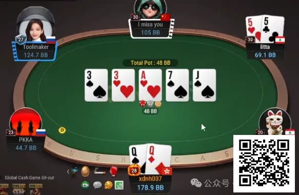 有些朋友觉得打得这么小肯定没有bluff,这是一种以己度人的想法——你觉得你自己这么打是没有bluff的,就觉得别人也没有bluff。但事实上就是有这么一种类型的人,特别喜欢用小注bluff。知道有这种人的存在后,我们就甭管他有什么bluff了,只要看底池赔率好不好,好的话就call。记住,我们不需要赢下每一个底池,只要4次里面对1次就够了。