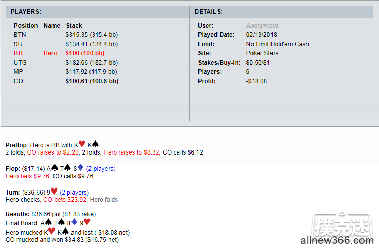 用口袋对3bet后,翻牌出现一张比口袋对更大的高牌,俗称“盖帽子”。这是种比较烦人的情景。很多玩家不敢用非AA的口袋对3bet,就是怕出现这样的局面。这篇文章就是讲下这种局面应该怎么打。